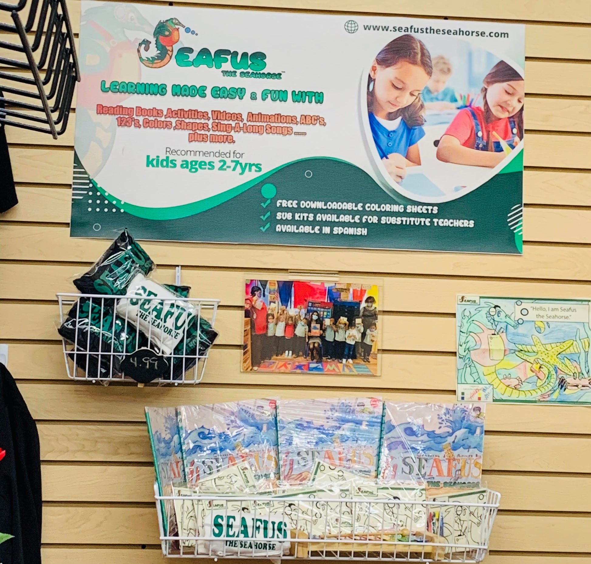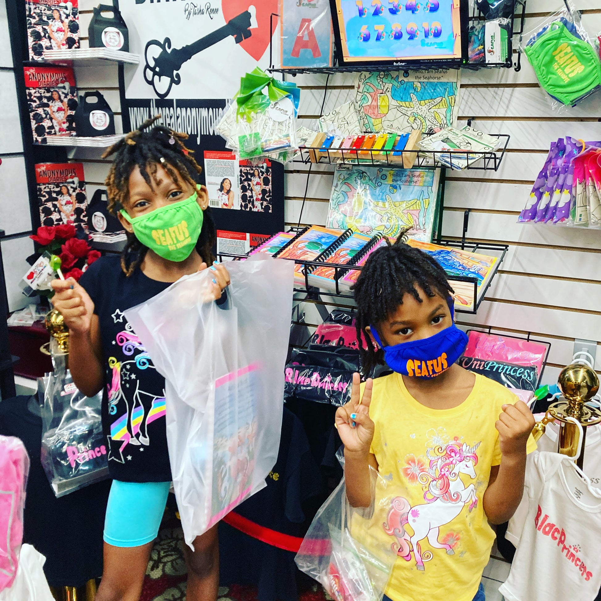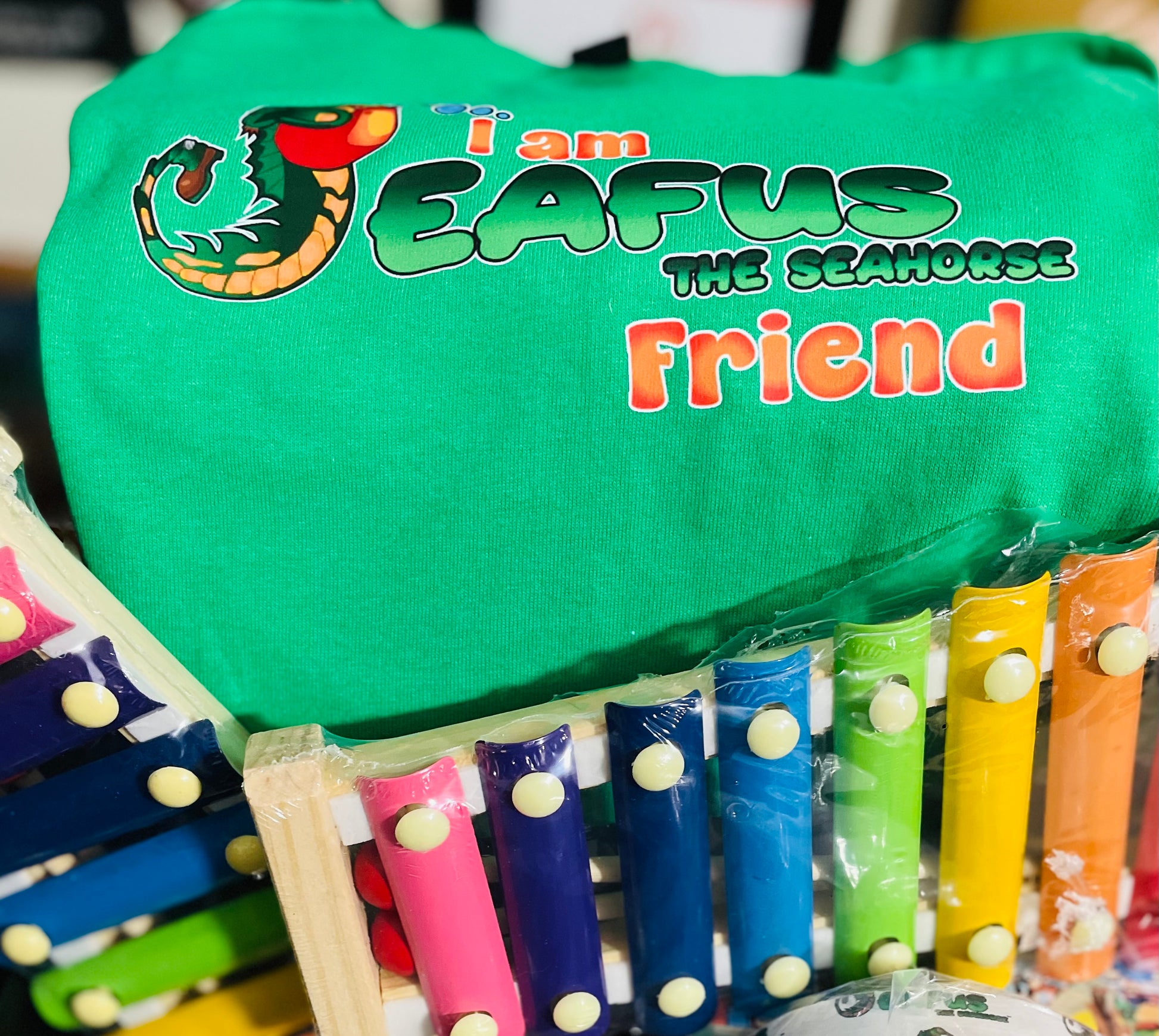 Seafus the Seahorse swag pack includes (1) Illustrated ,custom-handcrafted board reading, coloring & activity book ,(1) exclusive Seafus the Seahorse sing -along video; uploaded on a colorful usb that matches the book,(1) Exclusive Dramatized Voice Over for Seafus the Seahorse( Story time with Tasha Renee') uploaded on the same USB ;with extra storage space, (1) Seafus the Seahorse tumbler, (1) pack of crayons that will be needed for your child's coloring experience, (1) Seafus the seahorse custom keychain for zipper on the swag pack, one wooden xylophone musical instrument with mallets for kids: WARNING:CHOKING HAZARD Small parts. Not for children under 3 yrs. ,(1) pair of cool-neon signature Seafus-Bans/sunglasses to match your kids book, 1 bright colored -soft kids toothbrush for toddlers to promote healthy teeth, (1) "I am Seafus the Seahorse friend" random color pic for kids t-shirt (be sure to select your kids t-shirt size), (1) 16inch Seafus custom Swag Back-Pack (color pick random) and a set of special instructions on how to care for your kids book. All for a loaded value of $59.99 compared to $99.99. This book is unique and makes learning fun and easy for our babies. They are also great educational books and are great for family bonding time, bedtime stories, kid's parties, daycares, pre-schools, homeschooling, teachers, and so much more. Seafus the Seahorse is way more than a book. Adult supervision is required for kids under 7 years old. Seafus the Seahorse is ready to make new Friends!